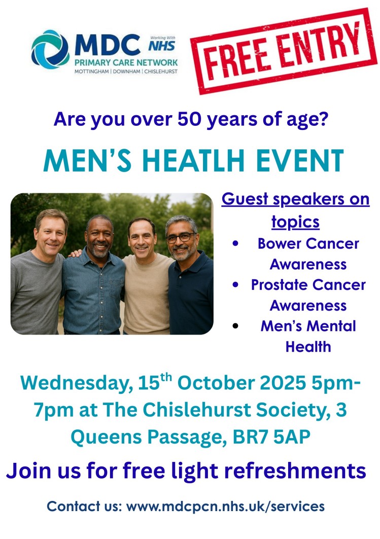 MDC PCN are running a one-off event for all male patients who are over 50 years of age and are registered with The Chislehurst Partnership or Links Medical Practice.